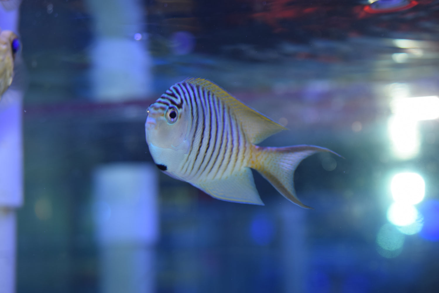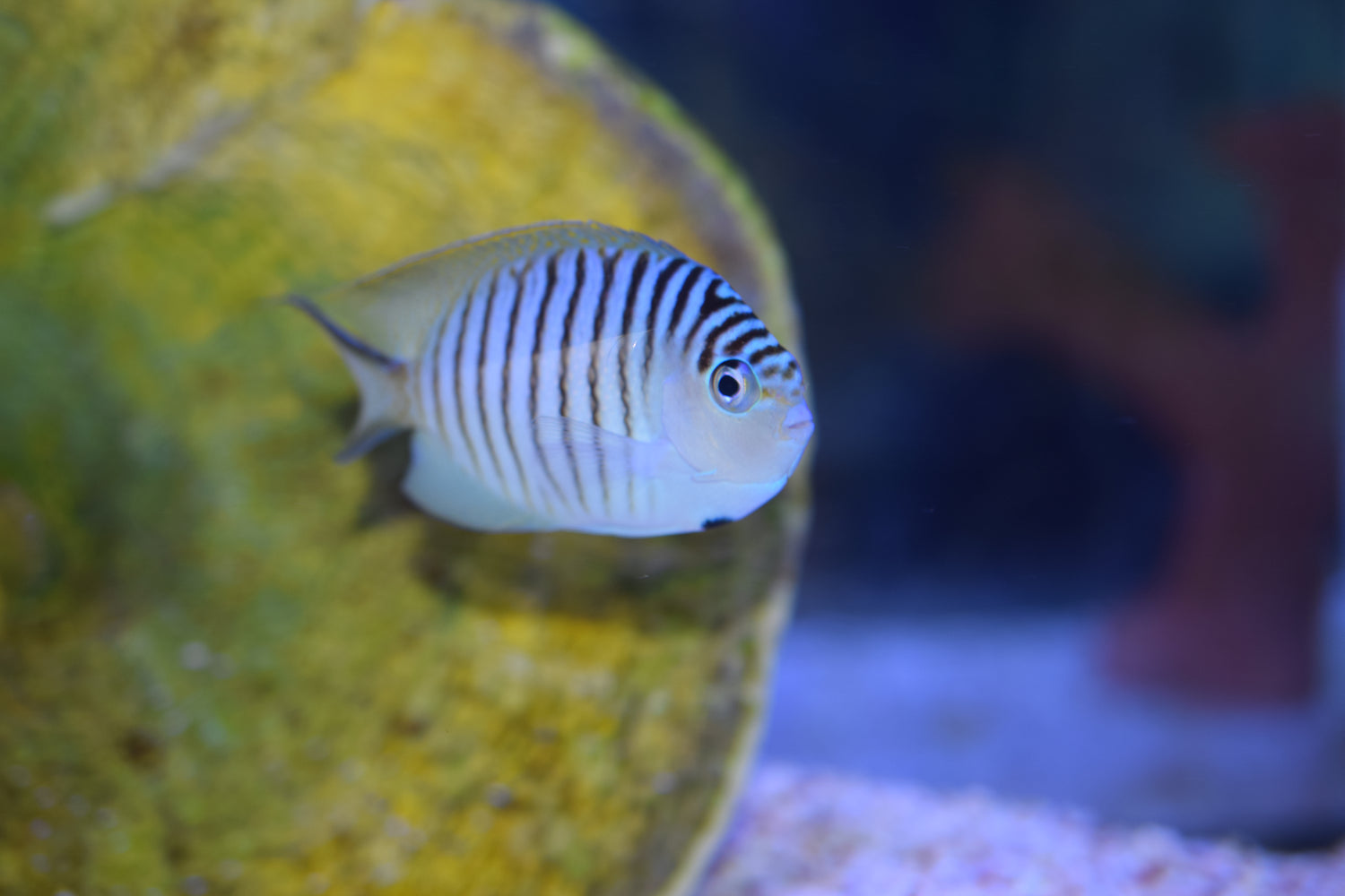 Description: The female Swallowtail Angel is known for its yellow dorsal and light-blue ventral coloration with a flared caudal fin. The male typically sports a light blue body with dark-blue vertical striping, and yellow accents. This angel is one of the best species to try in a reef tank, since they typically don't eat coral. In the wild, this species of angelfish typically live in harems. A harem can be achieved in a large home aquarium by adding a group of females, and the most dominant individual will transition into a male. A UV sterilizer and Protein Skimmer is required as this fish is prone to disease. Feeding Vitamin C on pellets everyday can help prevent diseases.